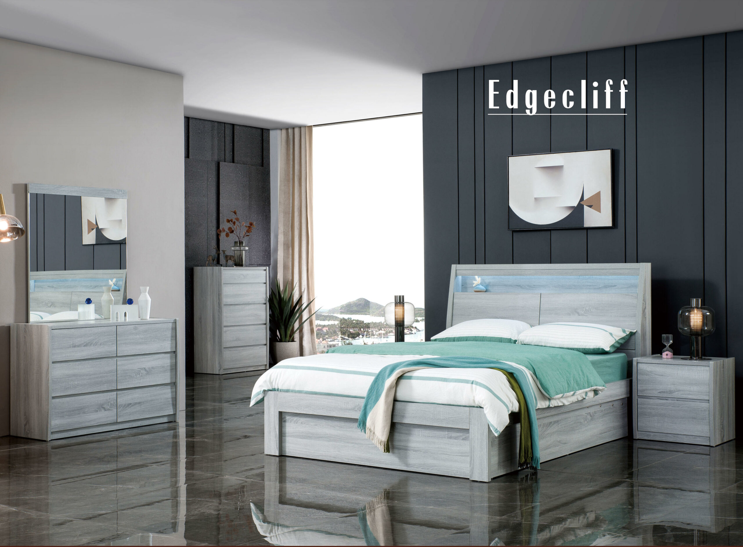 Ecliff 4 Piece Bedroom Suite: 1 x Bed Frame; 2 x Bedside Table; 1 x Tallboy for size Double, Queen and King