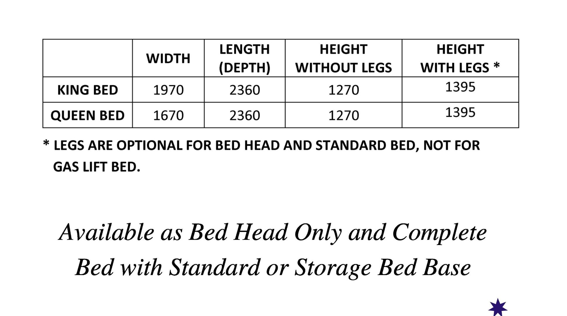 Available as Bed Head Only and Complete Bed with Standard or Storage Bed Base.