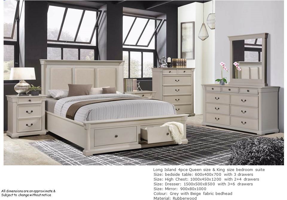 Long Island 4 Piece Bedroom Suite: 1 x Bed Frame; 2 x Bedside Table; 1 x 6 Drawer Tallboy
