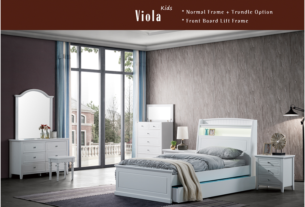 Ola 3 Piece Children Bedroom Suite: 1 x Bed Frame (NO TRUNDLE); 1 x Bedside Table; 1 x 5 Drawer Tallboy